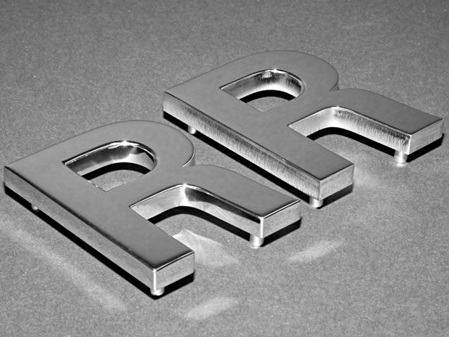 Spiegelpolierte Rs aus 10 mm V2a, Versalhöhe 100 mm, beide mit polierverrundeten Kanten, eines zusätzlich mit polierten Schnittkanten.