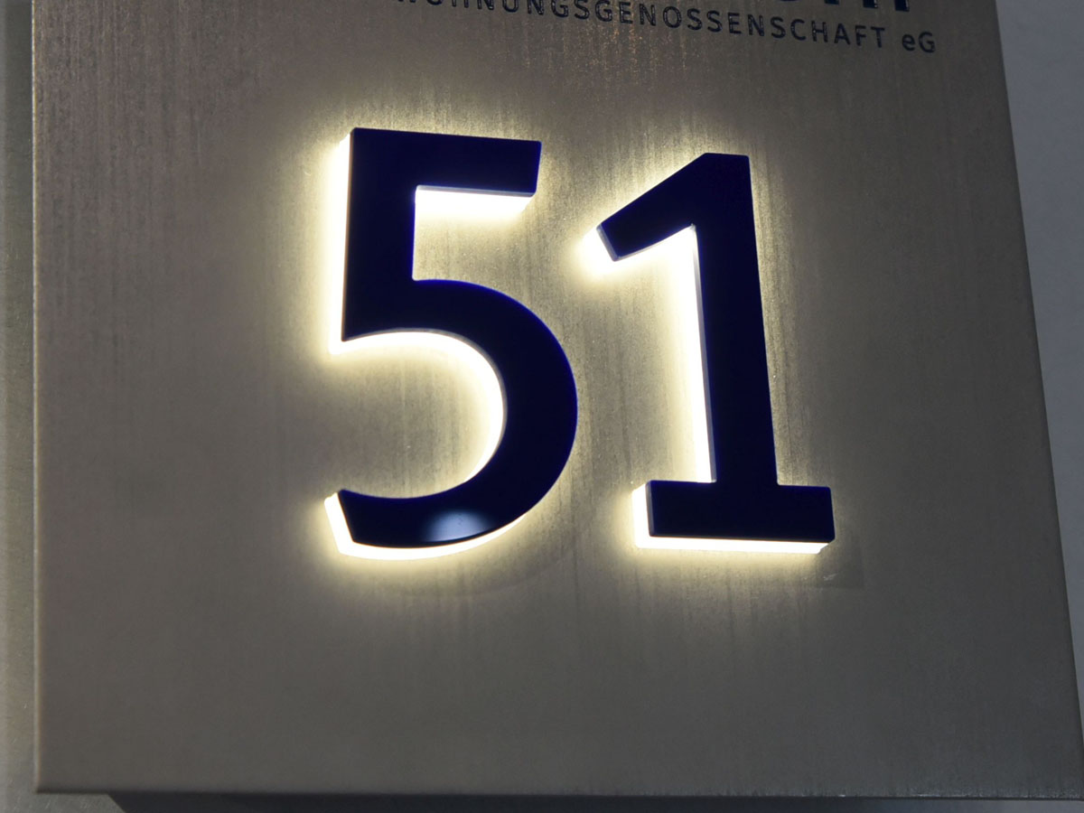 Edelstahl als Obermaterial hinterleuchteter Hausnummernschilder.